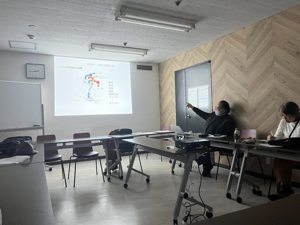 酒井さんからは、現在建設中の住宅で、デシックスという全熱交換型換気システムを導入している旨の報告がありました。室内の加湿・除湿を自動でコントロールし、室内環境を適切な状況でキープしてくれるという仕組みとの事で、2階建て住宅にこれを1台+エアコン1台で住宅全体の温湿度を安定させる計画との事でした。完成が楽しみです。
