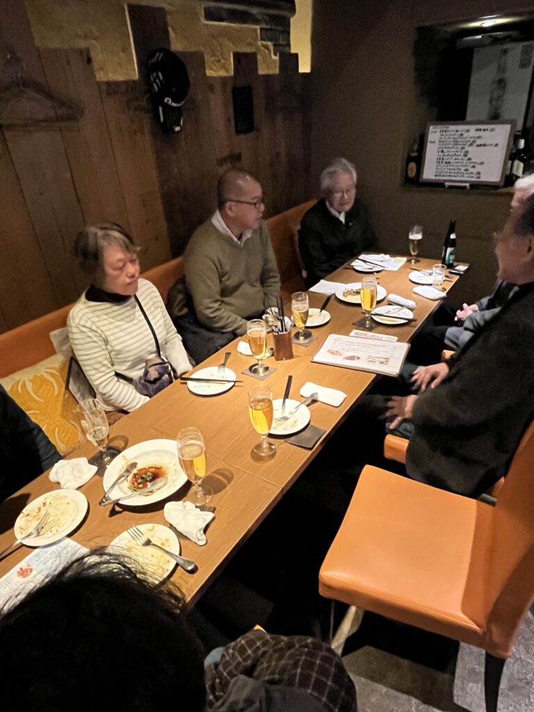 会議室退去時間となった後は、近くのイタリアンへ場所を移していつもの忘年会です。ここから参加の伊藤さんより、大阪万博会場建設に関わった話などしてもらいました。今年は参加者がやや少なく、会員の集まりが固定化かつ高齢化しつつあり、普段なかなかお会いできない会員への参加を何とか促していきたいところです。