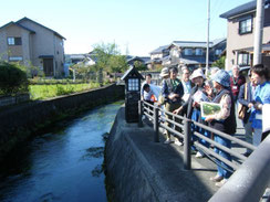 「かばた」とはこの地域に湧き出している水を生活用水として利用したシステムのことです。各家庭の庭先に、湧き水を引き込んだため池を囲んだ小屋が造られていて(屋内タイプも有)、昔は炊事や洗濯に使っていたそうです。またその湧き水のなかで鯉などが飼われていて、炊事の際に出た野菜のクズなどは鯉のエサとなり、きれいな水が保たれるという自然循環型のシステムになっています。現在では炊事や洗濯は家のなかで水道水を使い、下水へ流す方が多いようですが、湧き水は水温が一定なので、夏には野菜を冷やしたりという光景が多く見られるそうです。ガイドさんのお話を聞いて、地域の人みんなが使う水をお互いに大切に使おうという意識が根づいているように感じました。我々一行もガイドさんに紙コップをもらい、色々な家庭の「かばた」で湧き水を試飲させてもらいました。雑味がなくてとてもまろやかな味わい。それぞれの「かばた」によっても微妙に味の違いがあるとか。