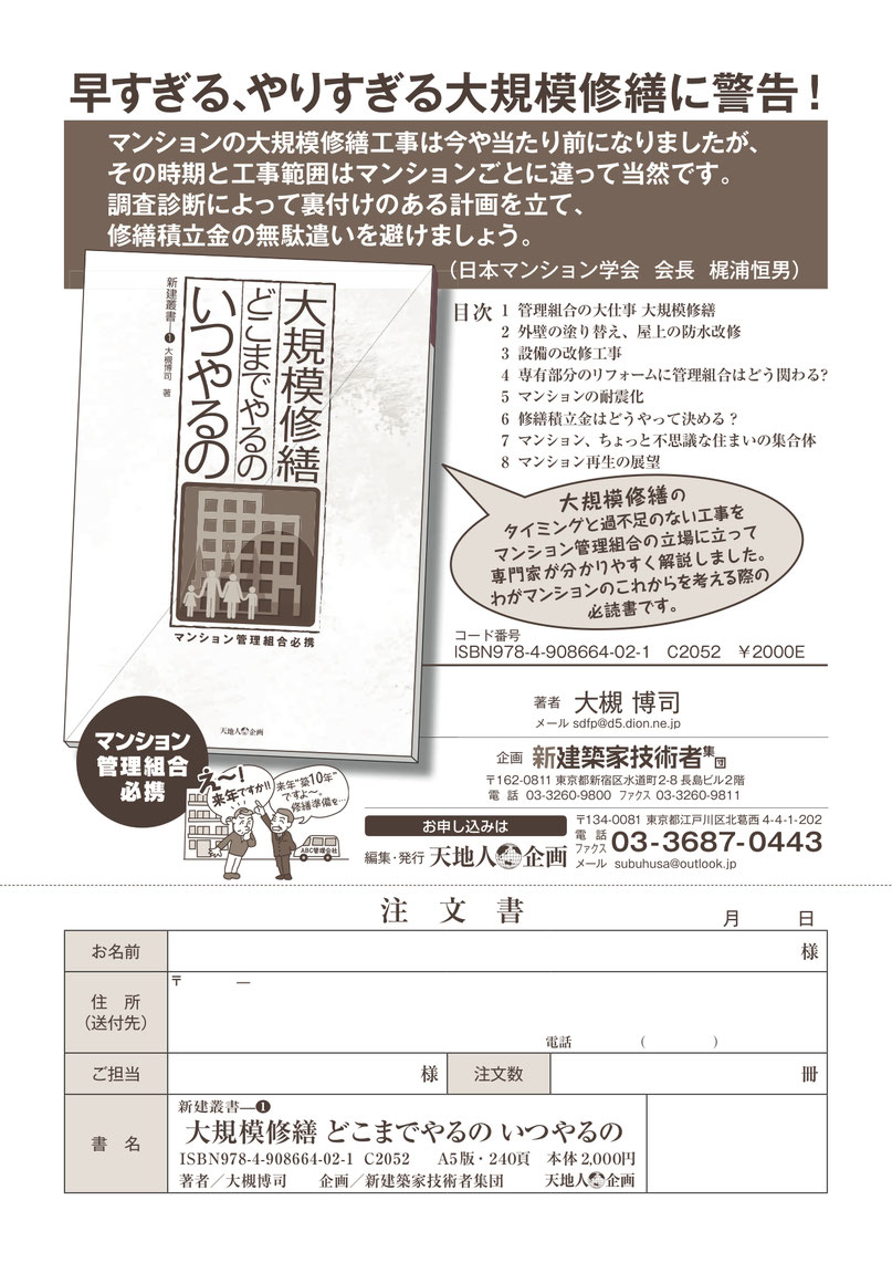 マンションの大規模修繕は今や当たり前になりました。三十数年前には見向きもしなかったゼネコンや設計事務所、あるいは管理会社が、「屋上防水も廊下のシートの貼り替えも給水管も取り替えも全部やりましょう」「何かあったら大変ですよ」と迫ってきます。大規模修繕の時期と工事範囲は、一般論で判断するのではなく、建物・設備の状態から裏付けをもって計画するべきです。この本は、「早すぎる、やりすぎる大規模修繕」に警鐘を鳴らす、マンション管理組合とマンションに関わる専門家のための一冊です。