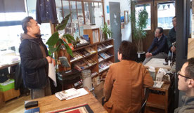 企画の最初に、加藤住建事務所にて加藤さんのつくる家のコンセプトや事務所内の内装についてお話しをうかがいました。長野での中部ブロックセミナーの発表では古着ジーンズとともに経年変化による「味」についてなどお話しいただきました加藤さんですが、事務所内も加藤さんの頭のなかをそのまま空間にした内装が広がっていて、参加者みなさん、興味津々で眺めていました。今後の企画住宅や、工房の有料貸出しのことなどお話しいただきました。参加者からの質問では、そもそもカリフォルニアスタイルなどに興味を持たれたきっかけはなんだったのかなど出ましたが、話が尽きないのでそろそろ工房へということで……。 事務所の隣の工房には、たくさんの機材や道具や塗料などがそろっていて、木の貯金箱とロールアップチェアの2コースに
