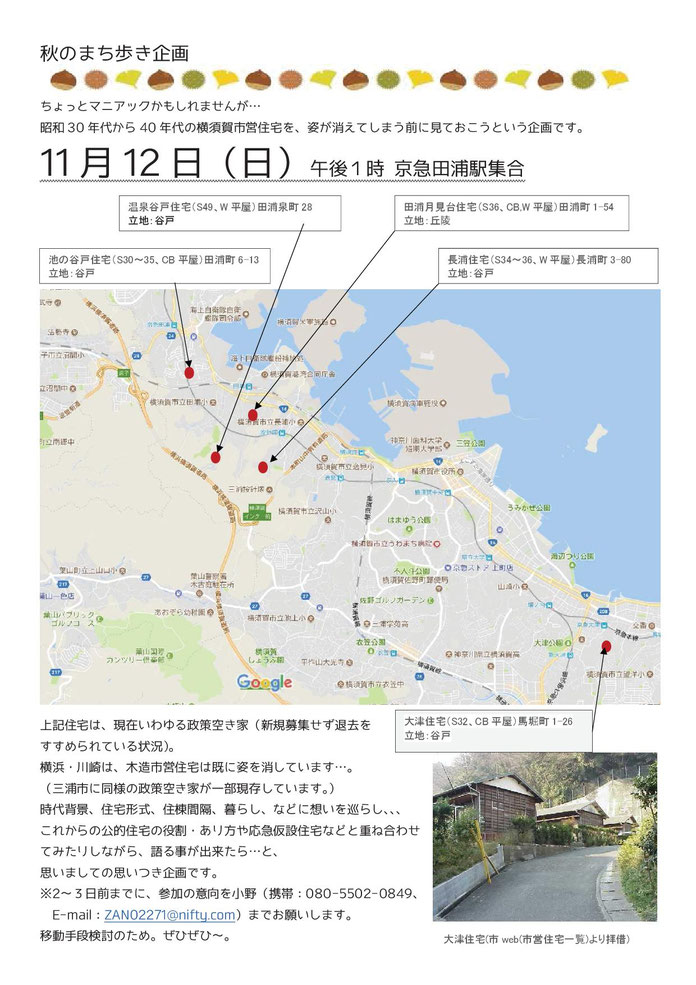 11 月 12 日、好天に恵まれた晩秋の日曜日、昭和の30 年代に建築された横須賀の市営住宅の見学ツアーに参加しました。発案は会員の小野さんで、7 月の湯河原に続くまち歩きです。