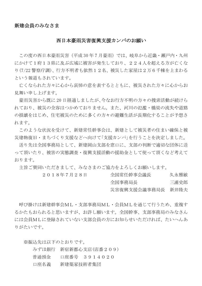 2018/08/04 西日本豪雨災害復興支援カンパのお願い 新建 会員のみなさま 西日本豪雨災害(平成30年7月豪雨)の発生から3週間を迎えますが、広域で引き続く酷暑の中、未だ被害の全貌もはっきりしていません。 被災地の復旧・復興支援に会員のカンパを要請すると決定しましたのでご協力のほどお願い致します。 添付「西日本豪雨災害復興支援カンパのお願い」にご賛同頂くと同時にお近くの会員にも周知の上、賛同を募って頂きたくお願い申し上げます。 2018年7月28日 全国常任幹事会議長 久永雅敏 全国事務局長 三浦史郎 災害復興支援会議事務局長 新井隆夫 tagPlaceholderカテゴリ: 2018年のお知らせ