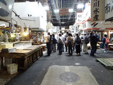 ガイダンスの最後に「築地市場は昭和モダンを代表する立派な建築であり、よく考えられた施設の配置は圧倒的物流効率を実現している。築地市場の再整備は、私たち市場関係者のためのものではない。私たちは築地市場という偉大な卸売市場を先人から譲り受けた。その私たちが後の世代に何を残すのか。それが問われている」と締めくくられ、市場へ移動しました。