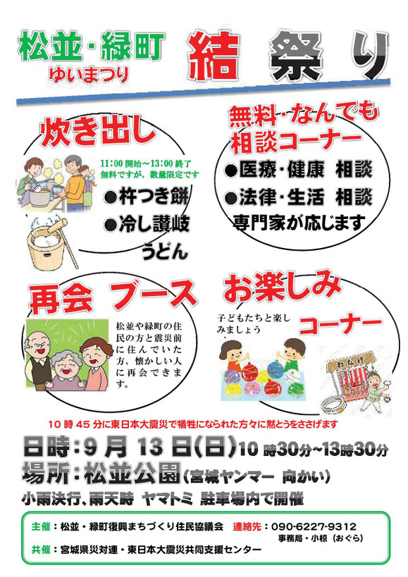 会場:東松島市 矢本運動公園仮設住宅 東集会所前(宮城県東松島市大曲字堺掘80)