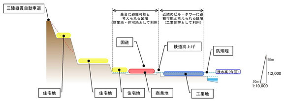 ②は大船渡市、釜石市などを想定し、分散型で市街地を生かしながら住居を高台に移す回避型の手法も併用。③は小規模集落が想定され、コミュニティーを崩さず高台移転する回避型で対応する。