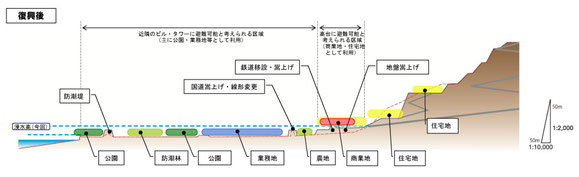 同日の会合では、復興ビジョン案に盛り込む津波対策の基本方針についても議論。基本方針を「再び人命が損なわれることがない多重防災型まちづくりと、防災文化を醸成し継承することを目指す」と設定し、海岸保全施設、まちづくり、ソフト対策の三つを組み合わせて対策を講じることを決めた。また、防潮堤などの整備目標は、過去に発生した津波を地域ごとに検証し、おおむね百数十年程度で起こり得る規模の津波を対象とするとした。