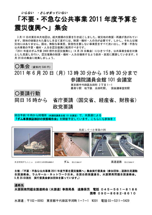 主催:「不要・不急な公共事業2011年度予算を震災復興へ」集会実行委員会