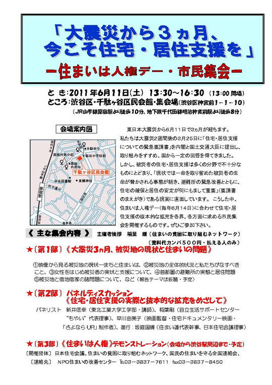 > 昨日、「大震災から3ヵ月 今こそ住宅・居住支援を!~「住まいは人権デー」市民集会~」が行われました。