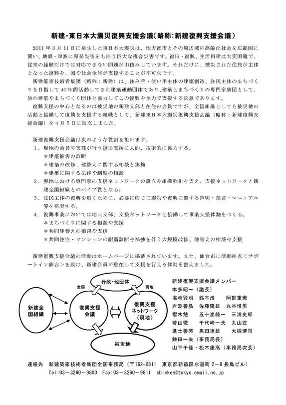 2011年4月5日(火)、新建築家技術者集団は全国常任幹事会に付属する新建東日本大震災復興支援会議(略称:新建復興支援会議)を設立しました。