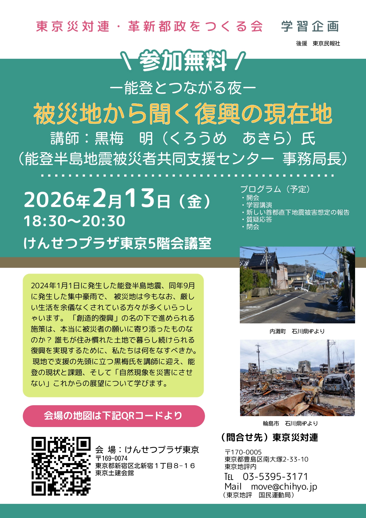 2 0 2 4 年 1 月 1 日 に 発 生 し た 能 登 半 島 地 震 、 同 年 9 月に 発 生 し た 集 中 豪 雨 で 、 被 災 地 は 今 も な お 、 厳 しい 生 活 を 余 儀 な く さ れ て い る 方 々 が 多 く い ら っ しゃ い ま す 。 「 創 造 的 復 興 」 の 名 の 下 で 進 め ら れ る施 策 は 、 本 当 に 被 災 者 の 願 い に 寄 り 添 っ た も の なの か ? 誰 も が 住 み 慣 れ た 土 地 で 暮 ら し 続 け ら れ る復 興 を 実 現 す る た め に 、 私 た ち は 何 を な す べ き か 。