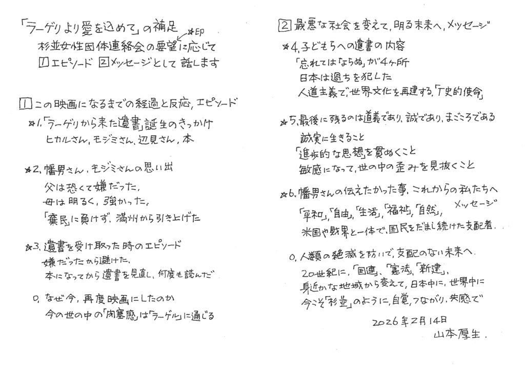上映後、山本幡男さん次男・山本厚生さんと、お母さんのモジミさんと原作『収容所(ラーゲリ)から来た遺書』を執筆された辺見じゅんさんをつないだ、厚生さんのつれあいのヒカルさんがトークをしました。2023年2月11日、映画が封切られて上映されている最中に板橋でも講演会を開催したこともあり、今回はスライドや資料を作成するにあたり一部を新建の山下がお手伝いしました。