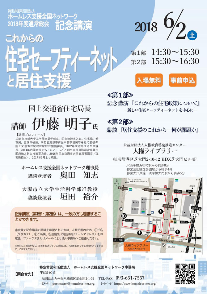 日時:2018年6月2日(土) 第1部 14:30~15:30 記念講演『これからの住宅政策について』 第2部 15:30~16:30 鼎談『居住支援のこれから―何が課題か』 会場:公益財団法人人権教育啓発推進センター・人権ライブラリー (港区芝大門2-10-12 KDX芝大門ビル4F) 主催:特定非営利活動法人 ホームレス支援全国ネットワーク