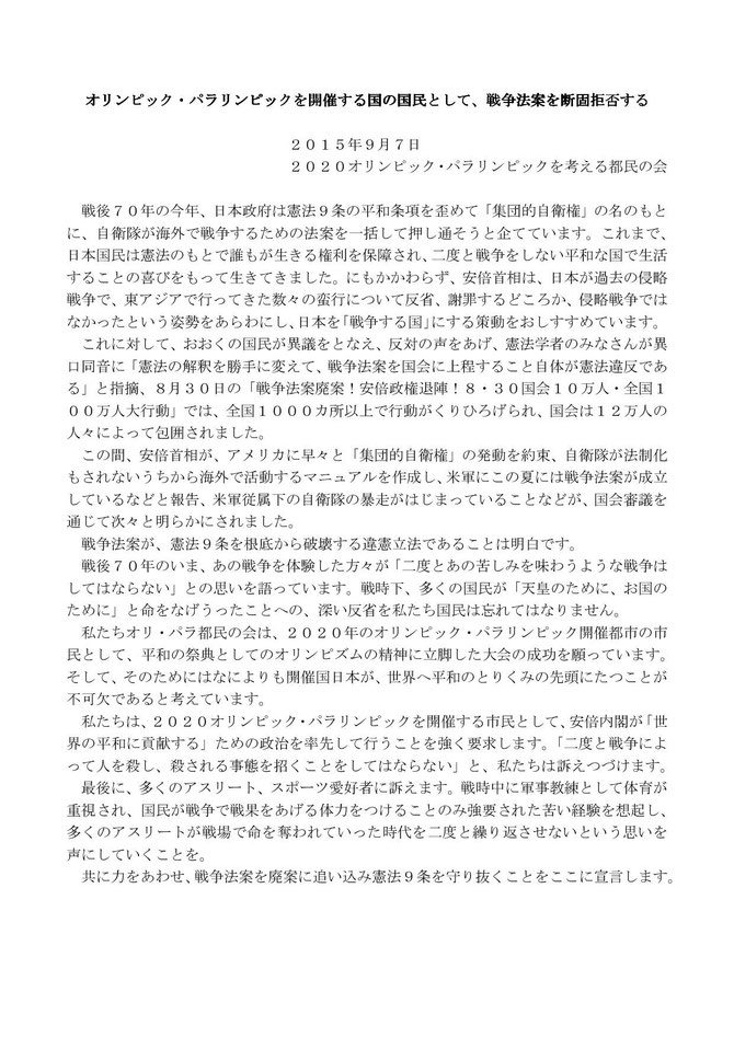 オリパラ都民の会は、2015年9月7日、戦争法案に対する声明『オリンピック・パラリンピックを開催する国の国民として、戦争法案を断固拒否する』を発表しました。