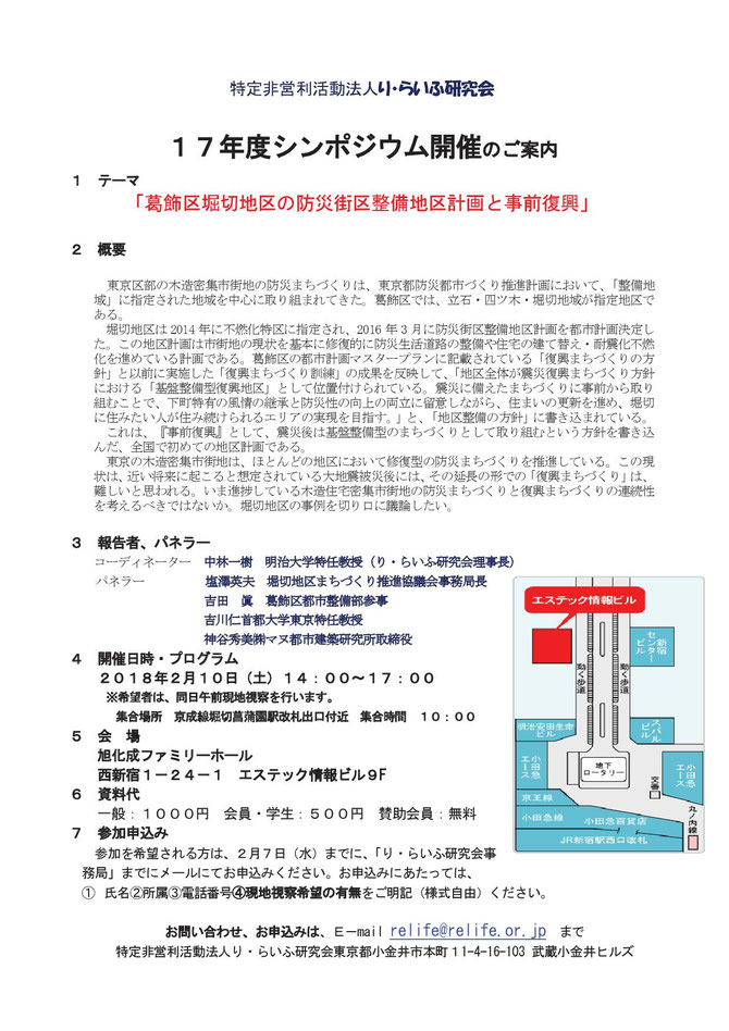 東京の木造密集市街地は、ほとんどの地区において修復型の防災まちづくりを推進している。この現状は、近い将来に起こると想定されている大地震被災後には、その延長の形での「復興まちづくり」は、難しいと思われる。いま進捗している木造住宅密集市街地の防災まちづくりと復興まちづくりの連続性を考えるべきではないか。堀切地区の事例を切り口に議論したい。